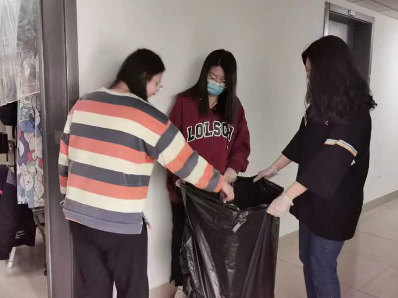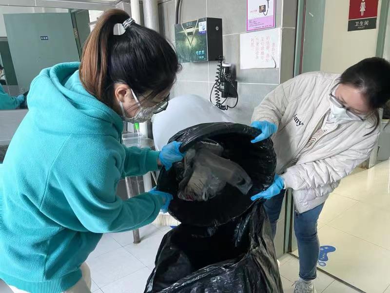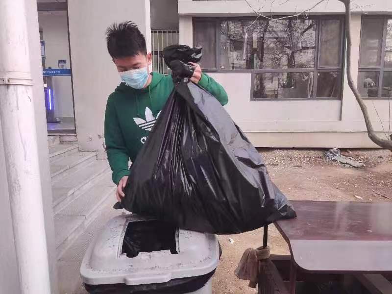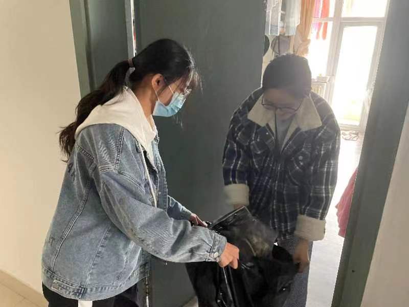 志愿者突击队积极展开防疫志愿服务活动。志愿者们负责定时回收同学们寝室生活垃圾,主动清扫各班教室卫生。