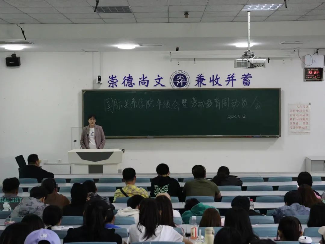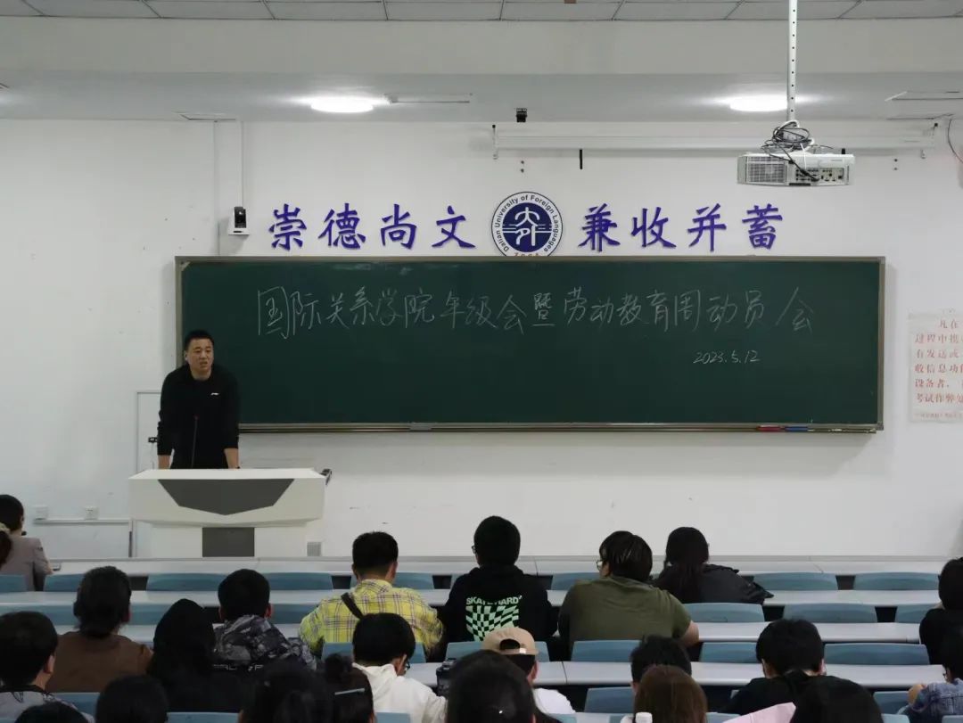 于明德楼101教室召开年级会暨劳动教育周动员会,辅导员侯培岩、毕如一及2021级、2022级全体学生参加本次会议。
