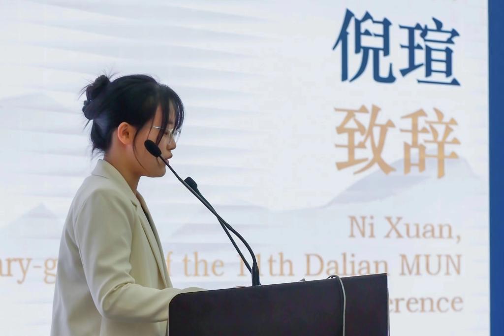 向来自全国13所高校的优秀学生表示热烈的欢迎。郝书记在发言中鼓励在座学生坚守初心,牢记使命,致力于国际合作和外交活动,成为未来的指路明灯;也赞扬了代表们对联合国理想的坚定奉献,他们致力于外交、合作和解决全球问题,展示了坚韧和不屈不挠的精神。郝书记由衷感谢共青团大连市委和学校领导对于过去十六年间举办过的十届大连模拟联合国大会的坚定支持,强调模联如今的成就离不开他们的帮助。最后预祝第十一届大连模拟联合国大会圆满成功,希望代表们讨论有成果,决议有影响,友谊能长存。