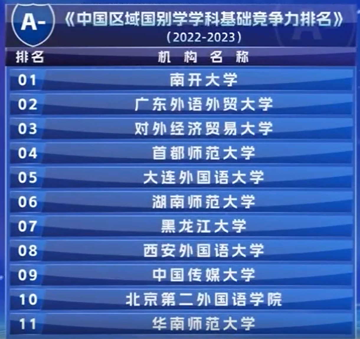 2024年11月18日,《中国区域国别学学科基础竞争力百强排名(2022—2023)》正式发布,大连外国语大学区域国别学学科获A-类第5名。这一殊荣不仅是对大外多年来在区域国别学领域不懈努力的肯定,更彰显了学校在服务国家战略、培养国际化人才以及促进全球文化交流方面的重要地位。