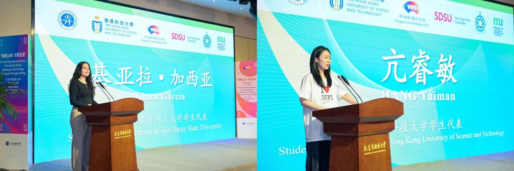 美国圣地亚哥州立大学基亚拉·加西亚、香港科技大学亢睿敏、香港都会大学陈梓薇、澳门理工大学吴家媛、我校富庚辰作为学生代表在开营仪式上发言。