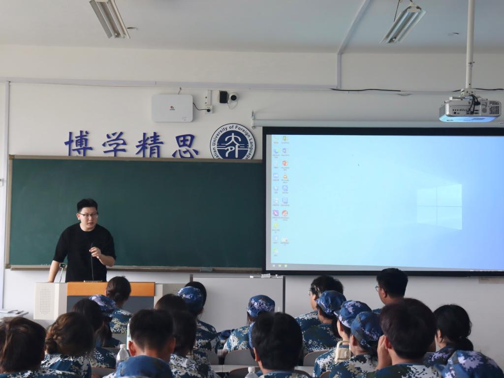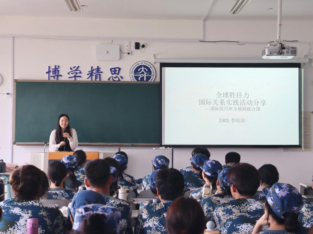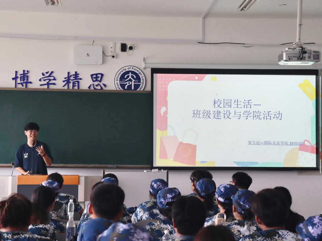 李昭阳介绍大连外国语大学模拟联合国协会与国际组织实验班相关内容。她从自身经历出发,分享参与模拟联合国会议、全球胜任力大赛、中外人文交流项目的体会与感悟,鼓励新生积极参与课外相关学术活动,通过不同平台拓展视野、提升专业素养。