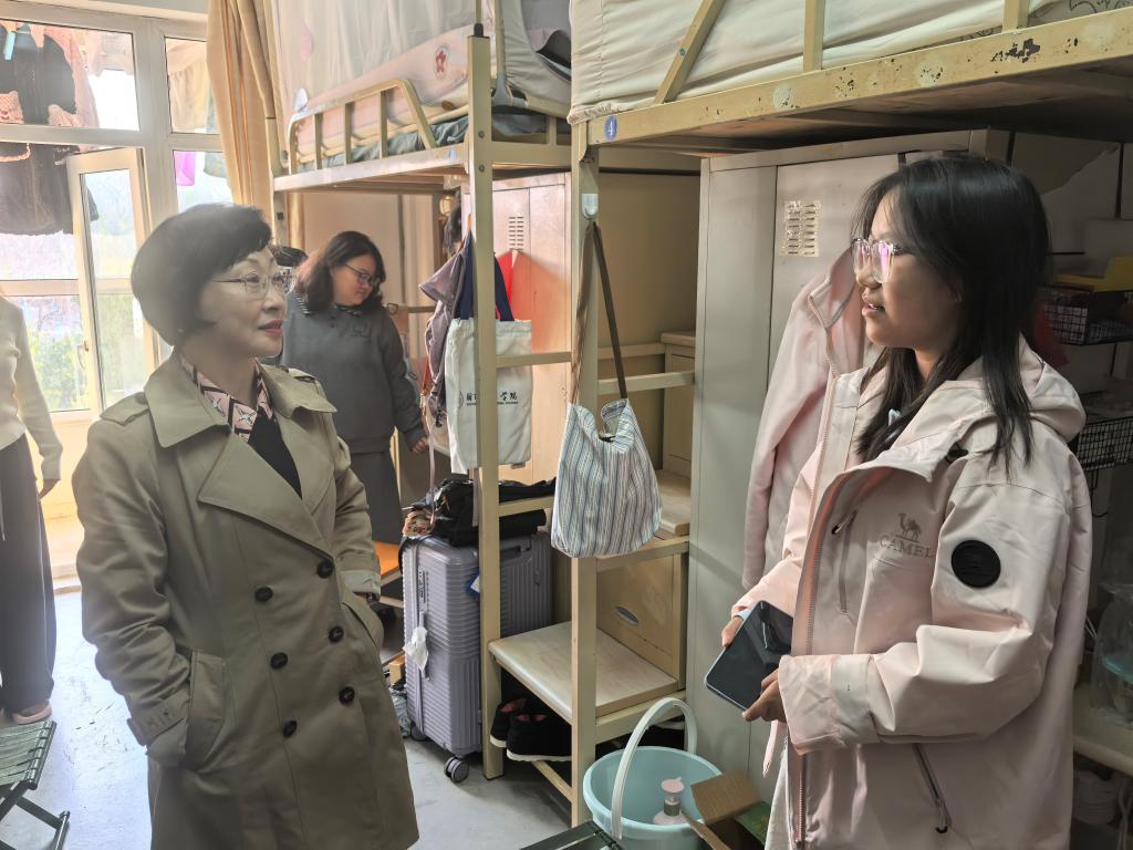 10月24日,体育博彩平台大全 党总支部书记郝利群与辅导员侯培岩、毕如一深入学生寝室开展走访调研。