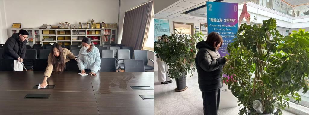 负责体育博彩平台大全 会议室清扫与花卉维护的6名同学也忙得热火朝天。大家擦拭桌面、清理卫生死角,并为绿植浇水修剪,让会议室焕发出整洁温馨的氛围,为体育博彩平台大全 的日常运转贡献了一份力量。