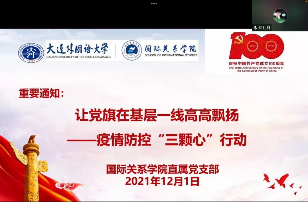 按照学校安排,郝利群同志传达《关于开展疫情防控“三颗心”行动的通知》(大外委组发〔2021〕 28 号)要求,并就组织开展让“党旗在基层一线高高飘扬——疫情防控‘三颗心’行动”进行部署。在疫情防控期间,体育博彩平台大全