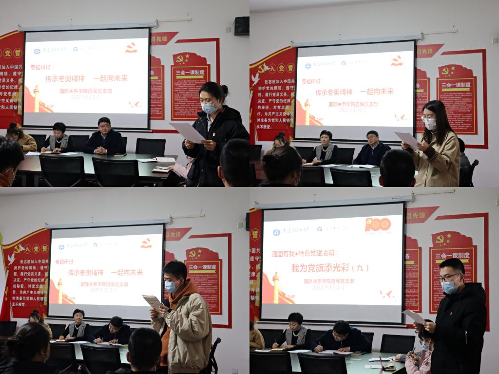 为更好地传承奥林匹克精神,彰显运动健儿激情飞扬、奋勇争先的时代特点,激励大学生刻苦求实,积极向前的奋斗热情,党日活动中,预备党员沈棋、毕晨汐,入党积极分子丁一鸣以“传承冬奥精神 一起向未来 ”为题,与大家分享观看冬奥会的感受和体会。他们谈到,在全球疫情和其他种种压力之下,中国文化中“家”所蕴含的团结和睦之义,正如生生不息的火焰,给世界带来温暖和希望。中国礼,与世界共举,与世界共庆。奥运健儿的每一个闪光时刻,背后都是不懈的奋斗和坚持,超强的信念和自律,永不放弃的决心和自信。在新征程上,要树牢理想信念,发扬拼搏精神,涵养道德品质,立砥砺强国之志、树实践报国之心。在拼搏中不断挑战自我,弘扬冬奥精神,一起向未来。