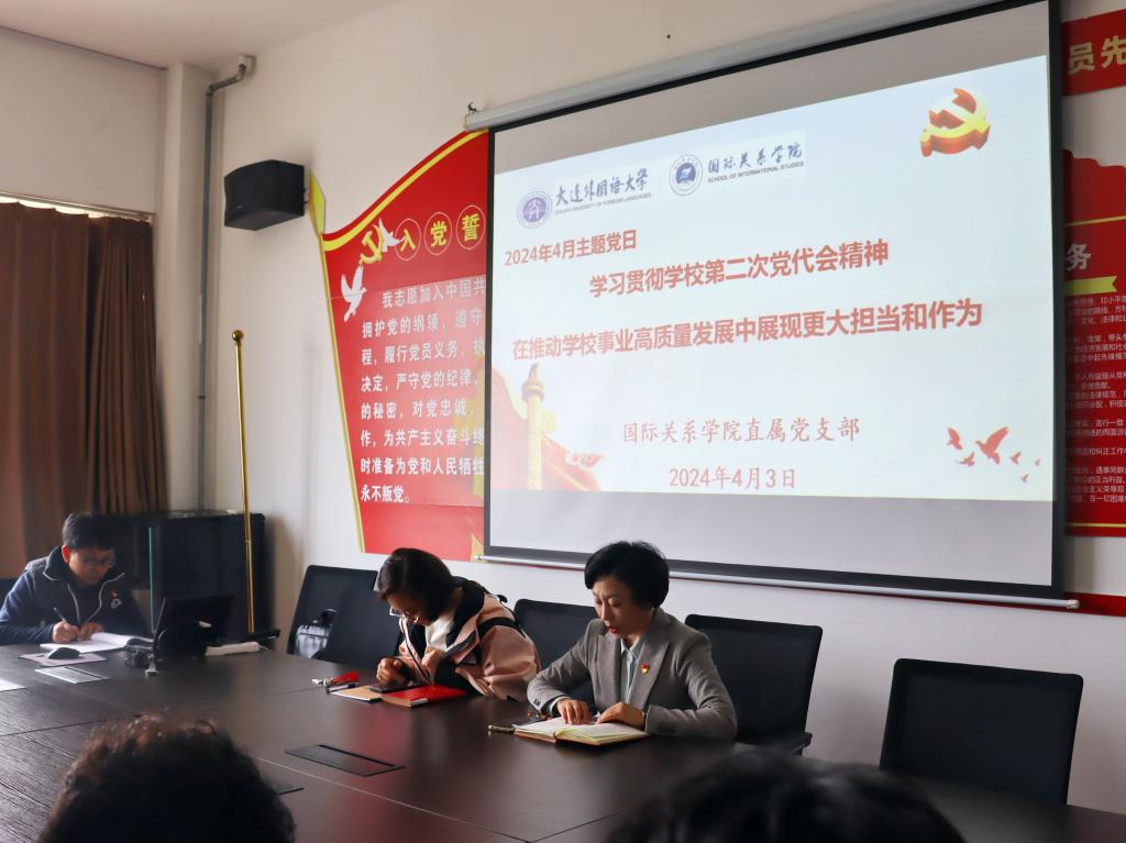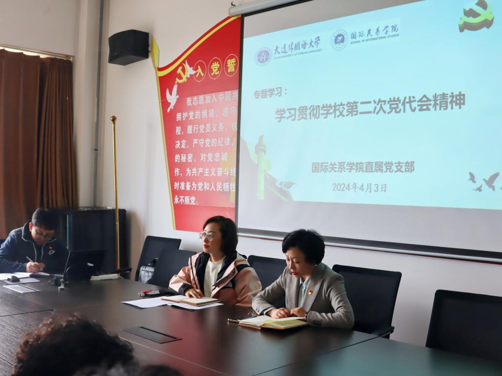 随后,郝利群组织集体学习贯彻学校第二次党代会精神。她指出,学校第二次党代会充分肯定了自第一次党代会以来学校取得的各项成绩并梳理了成功经验,在分析面临的机遇和挑战基础上,明确指出今后五年的奋斗目标和重点任务,对把握大局有十分重要的指导意义。她号召,国关全体师生要以学校第二次党代会精神为指导,为全面建成东北亚区域特色鲜明的高水平应用型外国语大学而接续奋斗。