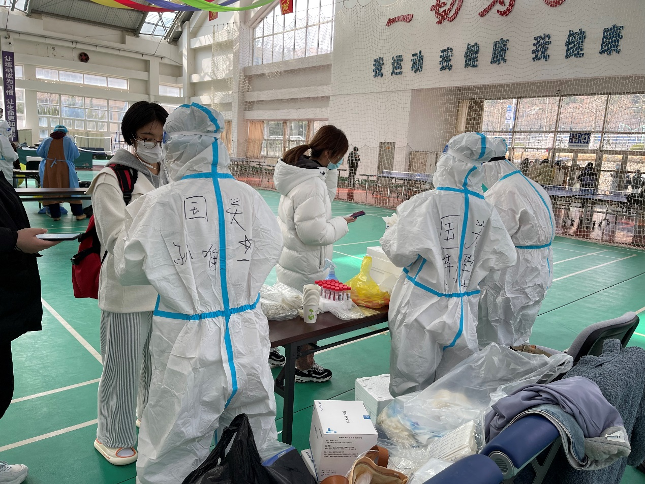操戈披甲,严守前线。“最清晰的脚步,踩在最泥泞的路上”,核酸检测可谓是疫情防控工作中非常关键的一个任务,每次志愿者们都需要工作近8个小时,在密不透气的防护服中,伴随着酸痛的肌肉和干涩的喉咙,他们不断重复着同样的动作。但是,国关志愿者们未有丝毫退却:他们身披防护服、手执采集管,毅然决然地守在了防疫第一线,服务全校学生。