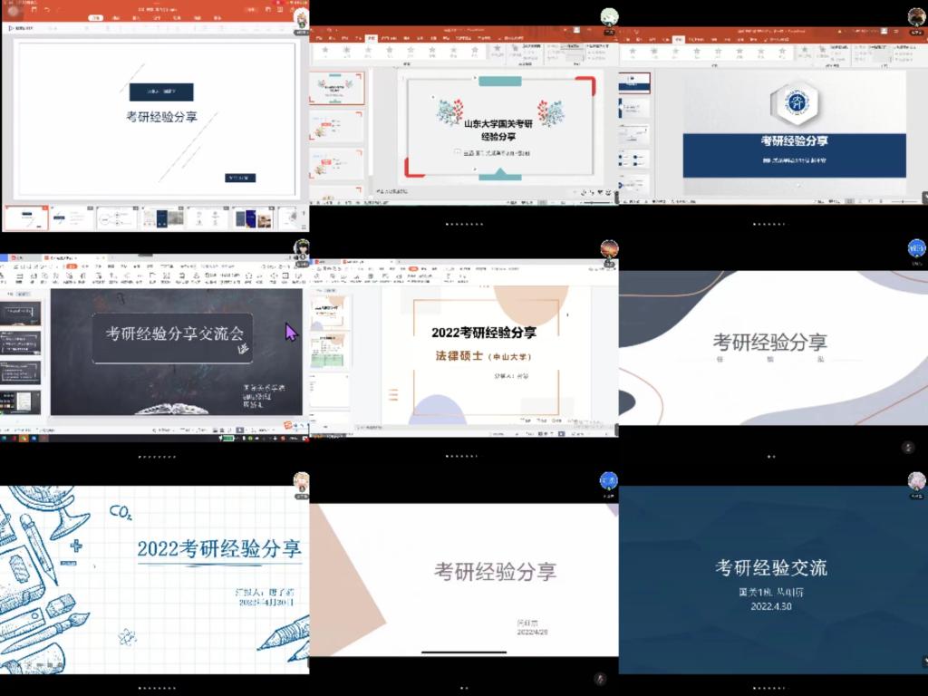 本次分享会邀请到闫红杰、孙颖、丛朝屏、任锦泓、赵平安、唐子茹、周骄阳七位2022届毕业生以及谢题艺、王涵两位2021届优秀毕业生,分别介绍了自己的备考经历。
