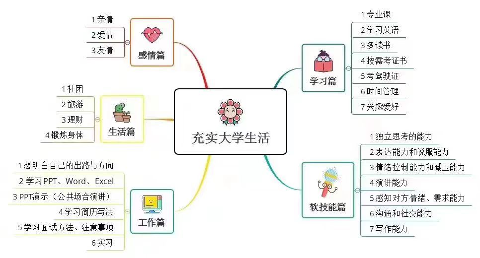 最后,也希望大家不要因为学习的忙碌而轻易放弃自己的兴趣爱好,也不要因为各种压力而忽视对家人的关系或轻视和身边人的相处。人的生活应该是多元的,我们要很努力,但不应功利,也不能急功近利。总之就是找到自己的节奏,好好度过大学四年,让自己以后回想起来也能够很充实,不留下什么后悔和遗憾。下面这幅图片蛮有意思的,还是我在大一的时候看到的,分享给大家: