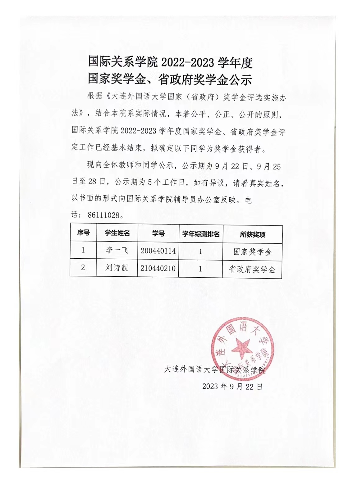 体育博彩平台大全 2022-2023学年度国家奖学金、省政府奖学金公示